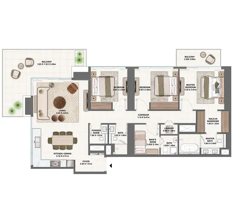 Residences are designed with open-plan layouts, floor-to-ceiling windows, private balconies or terraces, and natural material palettes. The interiors feature high ceilings, light-filled living spaces, and functional zones that maximise comfort and privacy.