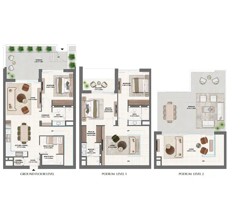 • 3 bedroom townhouses: ~3,253–3,265 sq ft